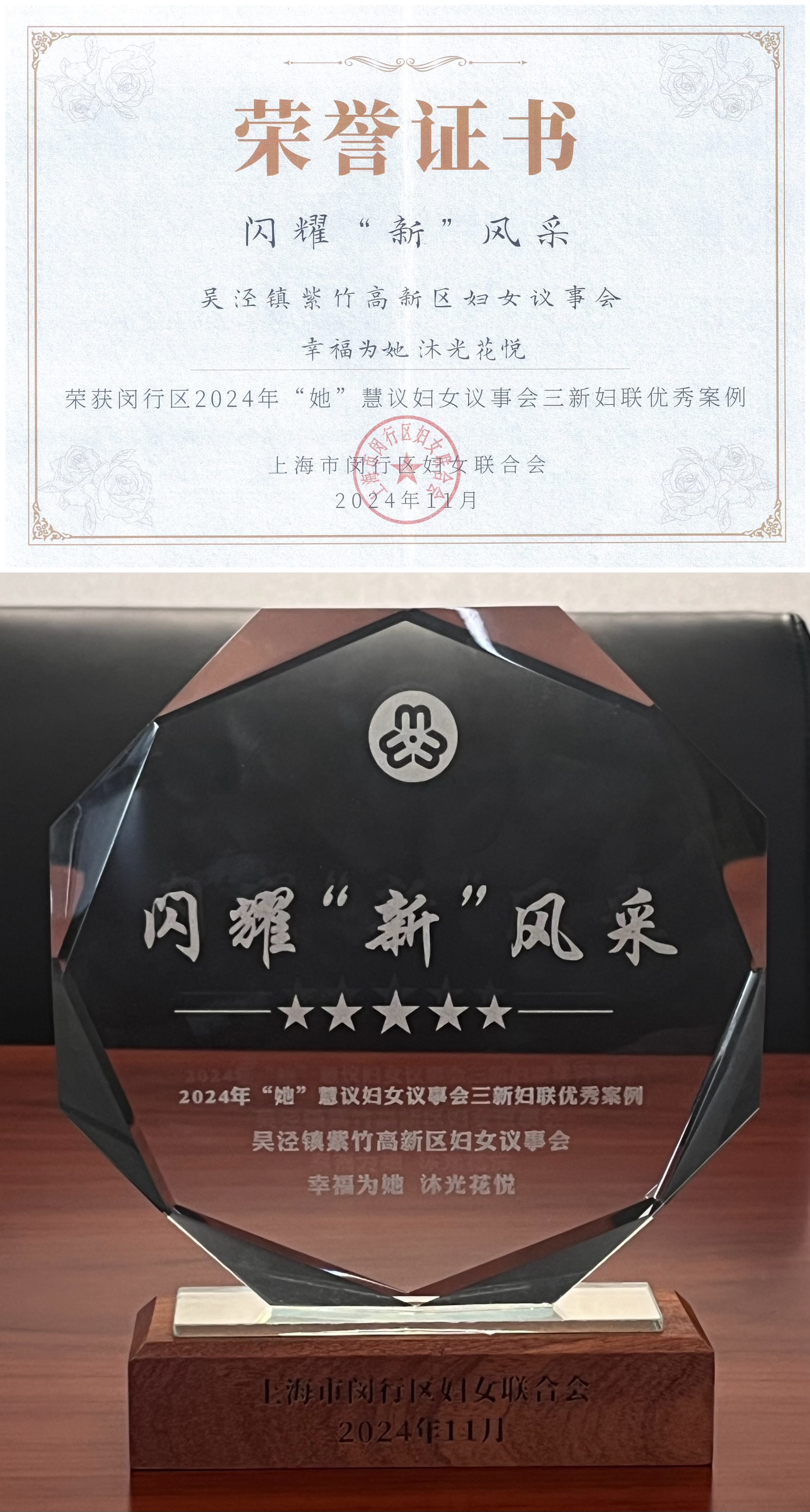 近日,在2024年閔行區婦聯婦女兒童議事項目總結會上,區婦聯黨組書記、主席劉芬及班子成員對表現突出的婦女兒童優秀議事案例進行表彰,紫竹高新區婦聯“幸福為她 沐光花悅”項目榮獲閔行區2024年“她”慧議婦女議事會三新婦聯優秀案例。