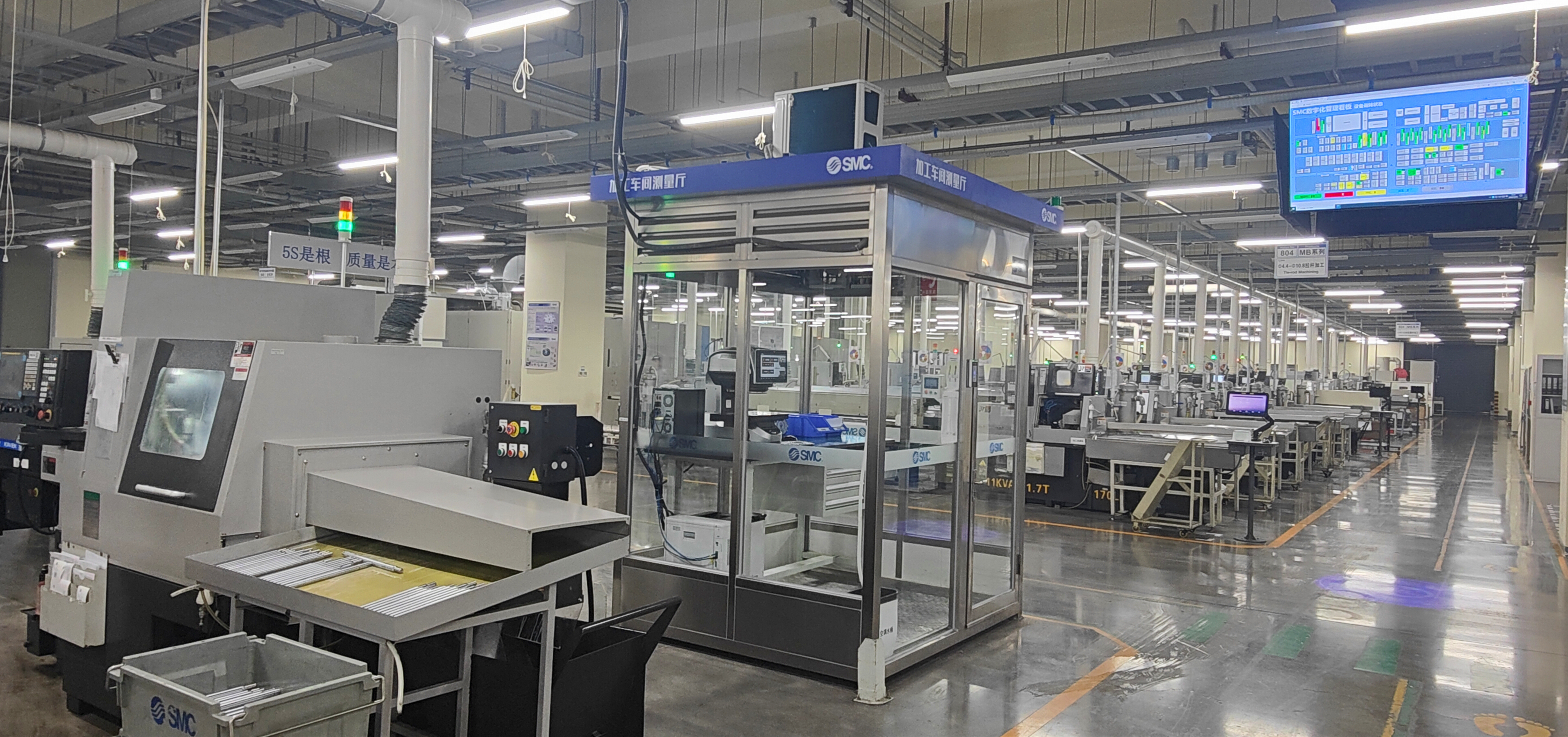 SMC自主研發先進排程系統(APS),構建高精度氣缸加工與裝配車間交貨期管理體系,有效提升響應速度和交貨期滿足率。設計開發設備三色燈數據采集盒,通過無線網絡實現設備稼動狀態的實時采集,利用IOT平臺進行數據的高并發和實時存儲,實現多端的稼動率可視化監控,提升關鍵設備的稼動率。質量控制環節中引入機器視覺技術,提高檢驗的準確度和效率。同時,SMC高精度氣缸加工車間注重綠色工廠建設,通過能源監控和環保監測平臺,優化能效比,確保生產活動環保合規。項目在多工藝應用場景中的效果為制造業的智能化綠色化發展提供了技術示范。