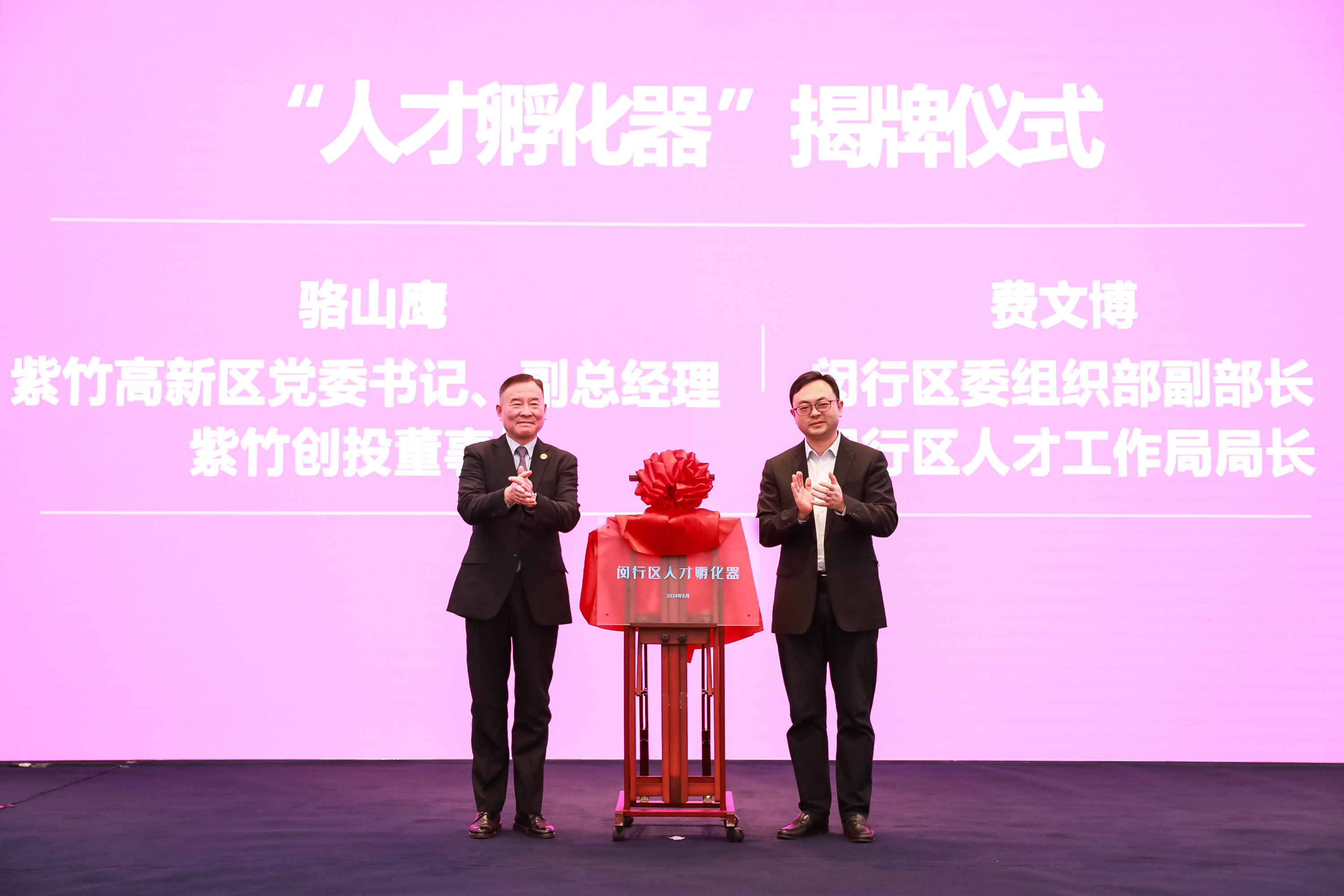 隨后,閔行區(qū)人才工作局局長費文博及紫竹創(chuàng)投董事長駱山鷹攜手為紫竹創(chuàng)投榮膺“閔行區(qū)首批人才孵化器”揭牌。