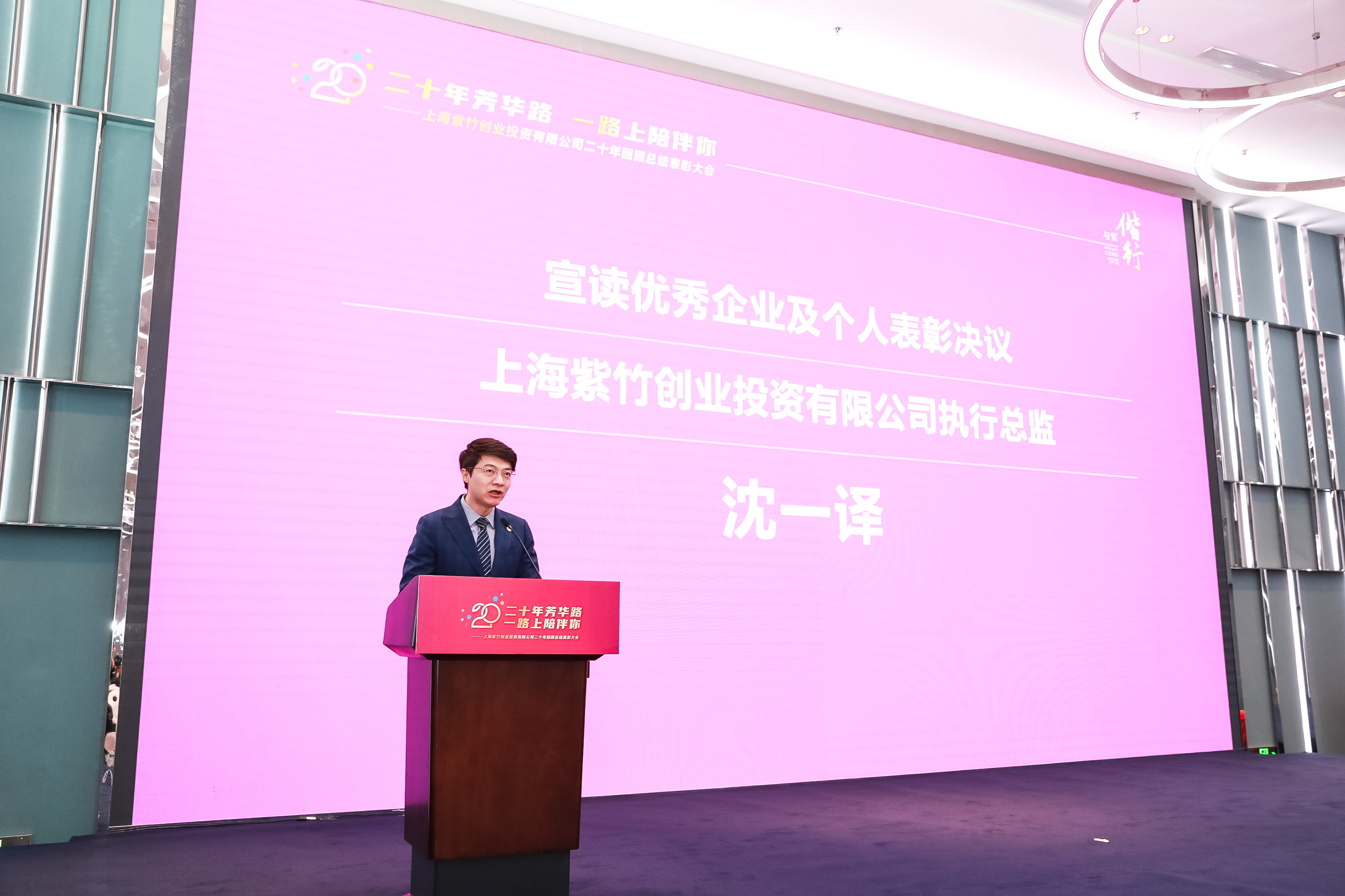 隨后,紫竹創(chuàng)投執(zhí)行總監(jiān)沈一譯宣讀紫竹創(chuàng)投優(yōu)秀企業(yè)及個人表彰決議,對二十年來紫竹創(chuàng)投孵化的優(yōu)秀企業(yè)及個人進行表彰及肯定。在二十年的發(fā)展過程中,紫竹創(chuàng)投培育出一批科創(chuàng)能級硬、技術(shù)壁壘高、市場認可、資本認可、產(chǎn)業(yè)認可的科創(chuàng)領(lǐng)軍企業(yè)。