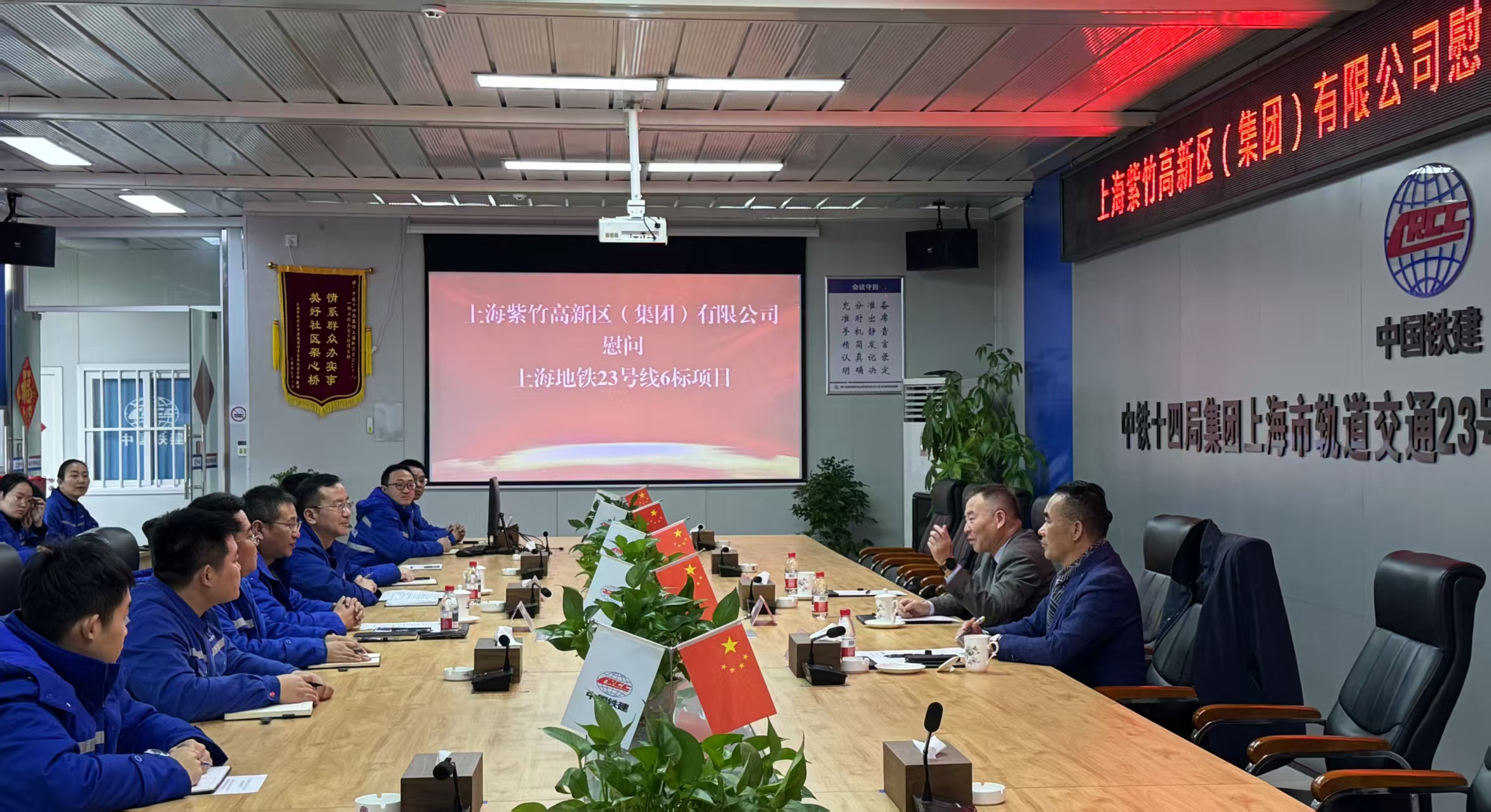 駱山鷹一行聽取施工方中鐵十四局項目進展及智能化施工、綠色工藝等技術亮點介紹,觀看了中鐵十四局穿越江河湖海城、書寫中國建筑奇跡的《穿越》紀錄短片。駱總表示,軌道交通是紫竹高新區發展的重要引擎,23號線建設對完善區域交通網絡、服務科技產業集群具有戰略意義,高新區將繼續全力做好服務保障,確保工程按時保質竣工,為區域發展注入新動能。
