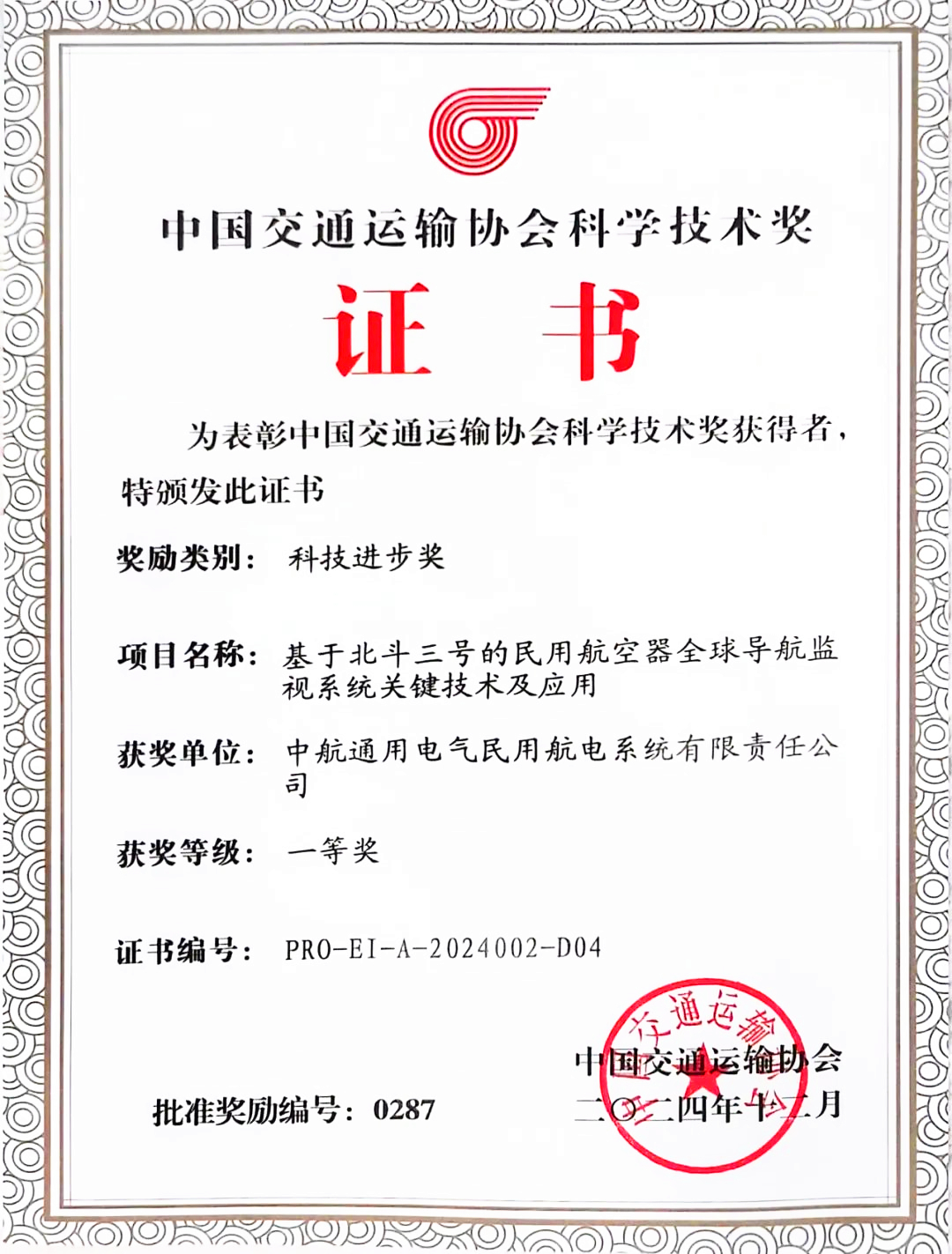 憑借其自主研發的北斗三號民用航空器定位追蹤系統,昂際航電與航科院等多家單位合作共同完成全球導航監視系統項目,榮獲中國交通運輸協會科技進步一等獎。
