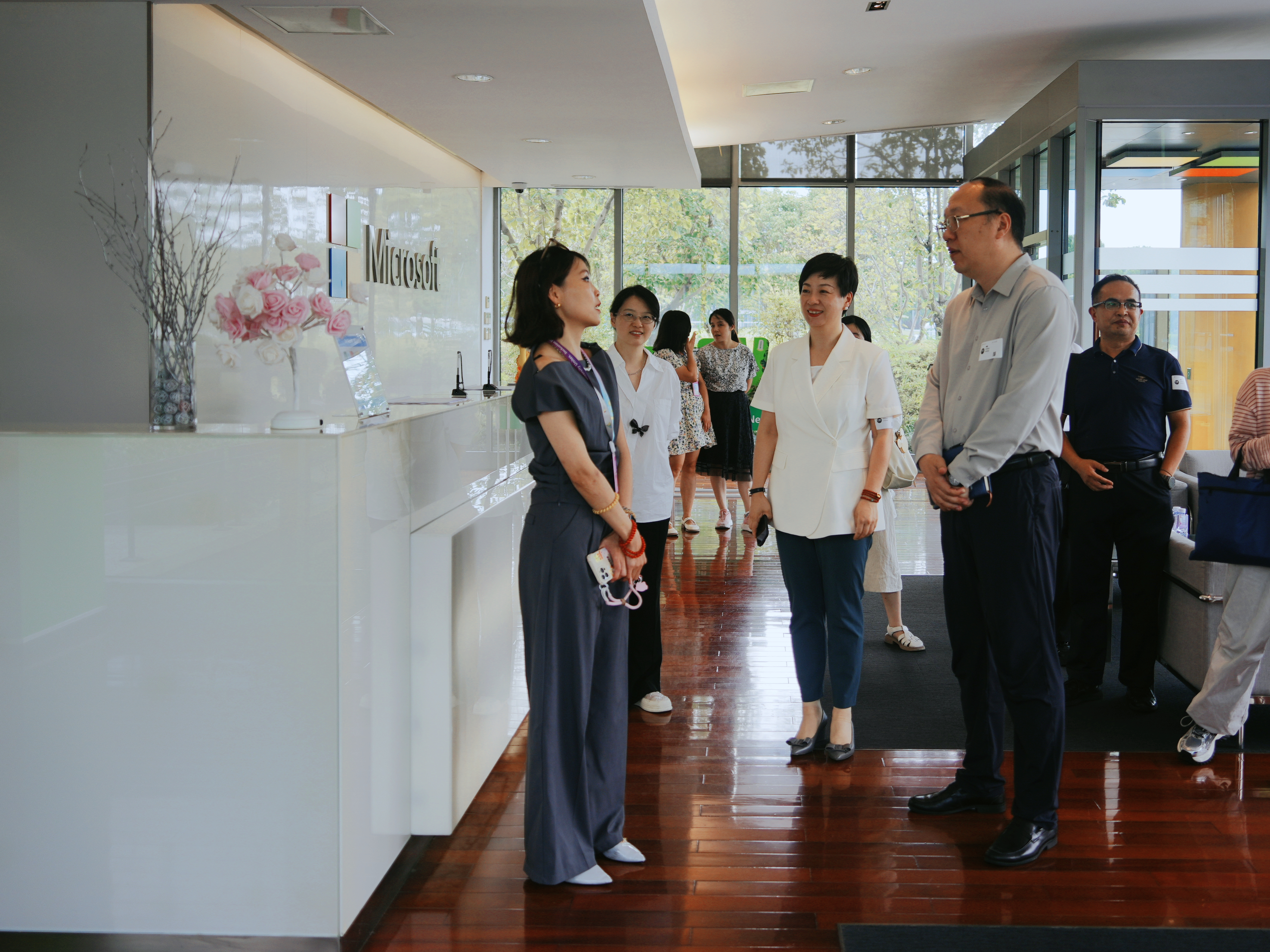 調研組一行首先走訪了高新區內入駐企業微軟公司,聽取微軟(中國)公司全球技術支持微軟云業務部門經理、大中華區女性社區負責人(上海)陸玥婷對企業以女性社區為載體搭建交流平臺,推動性別平等理念融入運營的情況介紹,隨后實地參觀了準媽媽就餐區、母嬰哺乳室、兒童作業區等女性權益配套設施。企業推行的彈性工作制、攜子女及家屬辦公等舉措展現的平衡員工工作與生活、營造人文關懷氛圍上的創新實踐與相關經驗,給調研組一行留下了深刻印象。