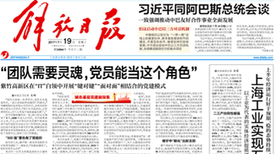 2017年7月19日,紫竹高新區黨建工作刊登于《解放日報》頭版頭條,作專題介紹
